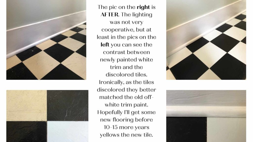 So, since the flooring is the same throughout the kitchen, pantry, foyer, and laundry room area, I am still using the floor tiles I bought at our Habitat for Humanity thrift store. I did discover that they weren’t exactly perfect, in that some of the white squares and black squares were slightly different size.