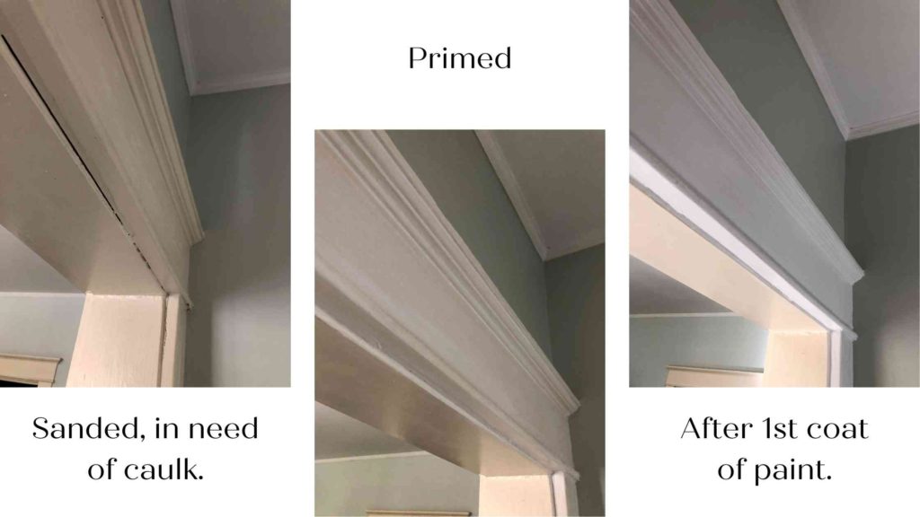 So in addition to just sanding the semi-gloss trim for proper adhesion, there was quite a bit of patching and smoothing to do. And I’m learning this one very important lesson (that may apply to other areas of life): I have to quit before it’s perfect or I’ll never be done.
