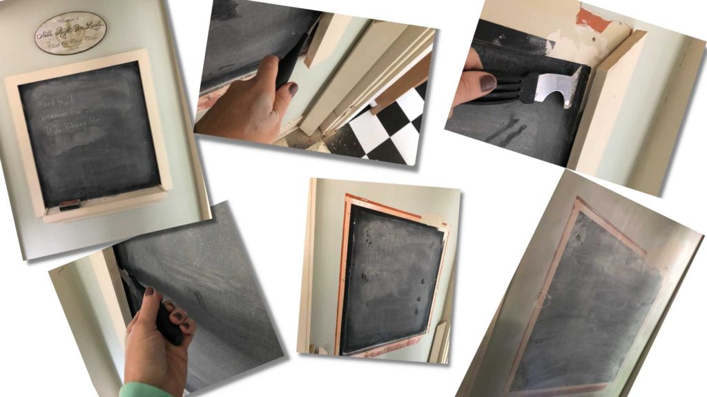 I carelessly began pulling down the wood trim around the chalkboard area because I had noticed a gap pretty much all the way around. But the top, which was ever so slightly above my eye level should have been sliced through with a blade. The trim held onto the wall paint and tore a large piece of two color layers of paint off the wall.